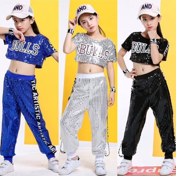 พร้อมส่ง ชุดเต้น ฮิปฮอปปักเลื่อมเสื้อแขนสั้น+ ขายาว