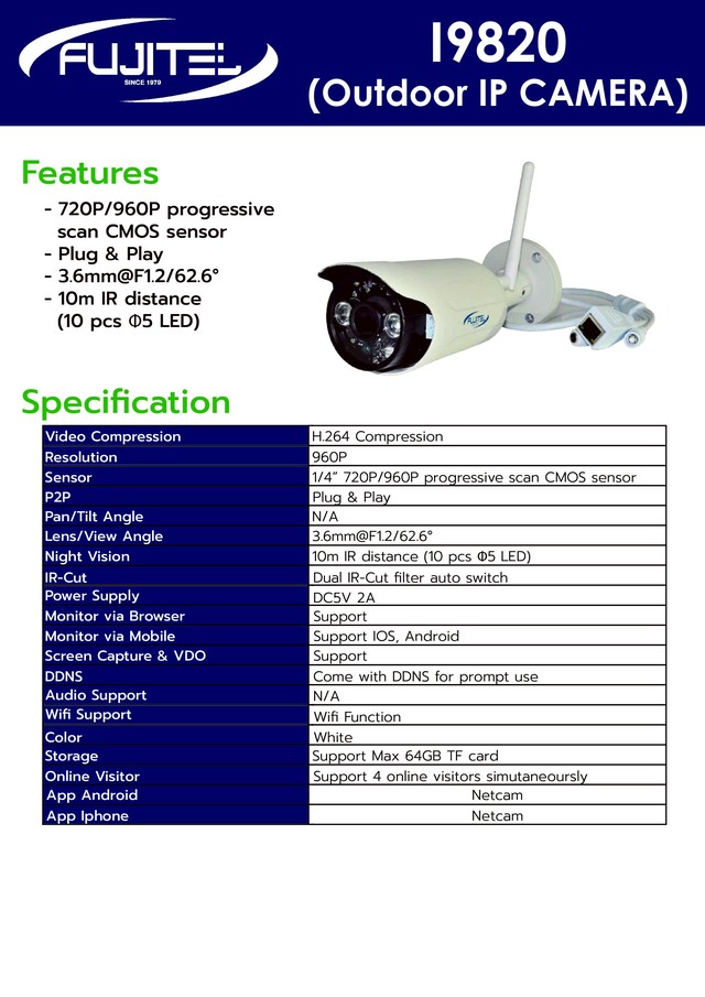 กล้องวงจรปิด Wifi IP Camera (Outdoor) Fujitel รุ่น I9820 ฟรี SD Card 32GB