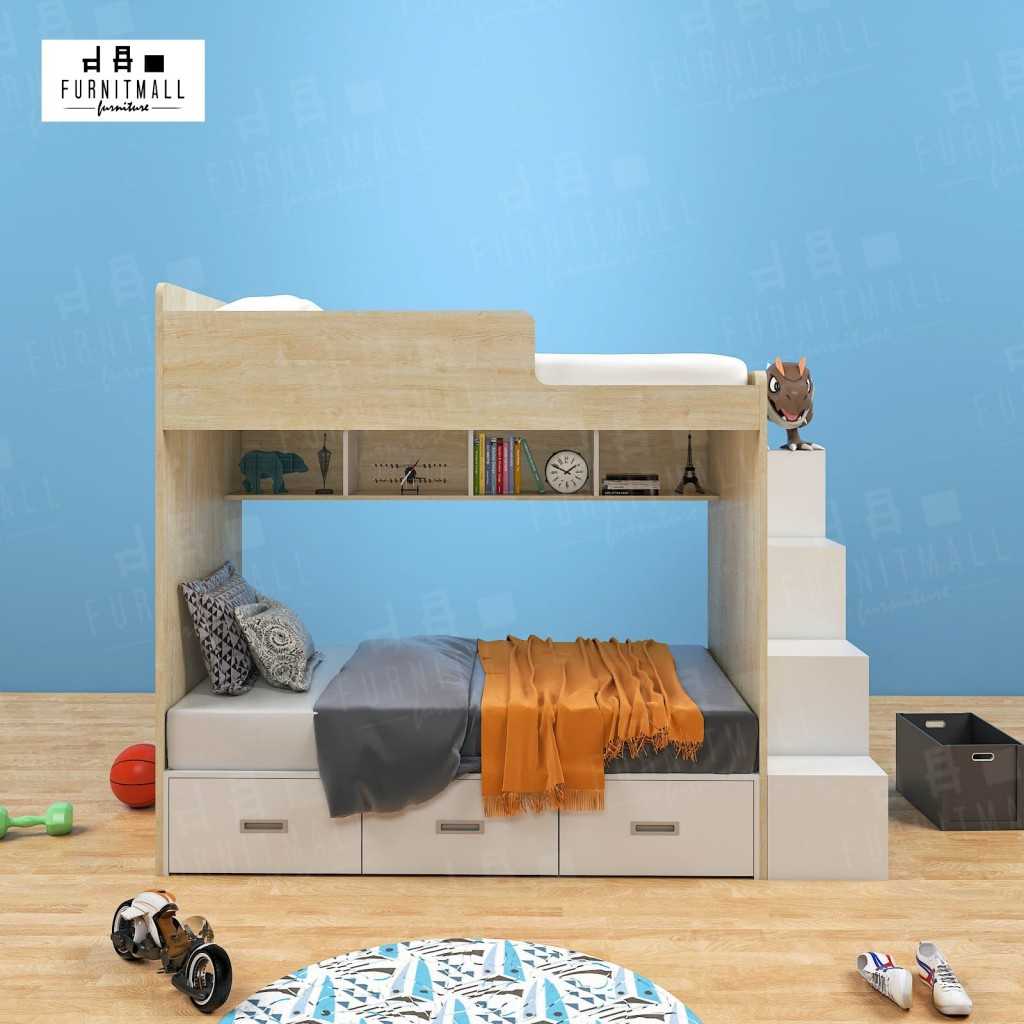 เตียงสองชั้น 3.5 ฟุต พร้อมกล่องบันได ไม้ปิดผิวเมลามีน แข็งแรง