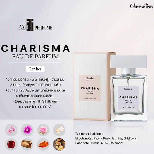น้ำหอม กิฟฟารีน คาริสมา เออ ดิ พาร์ฟูม น้ำหอมสำหรับคุณผู้หญิง แนวกลิ่น Flora สร้างเสน่ห์ความหอมโดดเด่นด้วยกลิ่นอายความหอมของดอก Peony (ดอกโบตั๋น) เอกลักษณ์ของความสวยงาม หรูหรา มีระดับ พร้อมหยอกเย้าความสดชื่นด้วยกลิ่น Red Apple ผสานกลิ่นอายความหอมนุ่มนวลของ Blush Suede, Rose, Jasmine และ Gillyflower ช่วยเสริมเสน่ห์ให้คุณเป็นผู้หญิงที่มีความอ่อนหวาน หรูหรา มีระดับ ชวนหลงใหล
