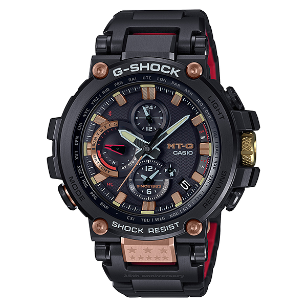 พื้นผิวสาย กรอบหลัง ชิ้นส่วนโลหะ และหน้าปัดนั้นตกแต่งด้วยสัญลักษณ์ G-SHOCK สีแดง ควบคู่ไปกับการใช้สีแดง สีทอง และสีเหลืองเพื่อเฉลิมฉลองการครบรอบ 35 ปีของ G-SHOCK
