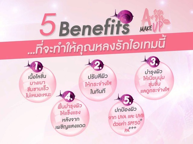 · อุดมด้วยคุณค่าของสารสกัดเมือกหอยทากจากประเทศเกาหลี ผสานวิตามิน อี และวิตามิน บี 3 ช่วยให้ผิวเนียนนุ่ม ชุ่มชื่น เนียนกระชับ ลดเลือนริ้วรอย ให้ผิวแลดูกระจ่างใสอย่างเป็นธรรมชาติ