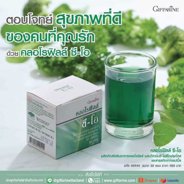 คลอโรฟิลล์ ซี-โอ ผลิตภัณฑ์เสริมอาหาร คลอโรฟิลล์ ผสมวิตามินซี โอลิโกฟรุคโตส และสารสกัดจาก แอปเปิ้ล ชนิดผง ตรา กิฟฟารีน ส่วนประกอบที่สำคัญโดยประมาณใน 1 ซอง (1 กรัม):
