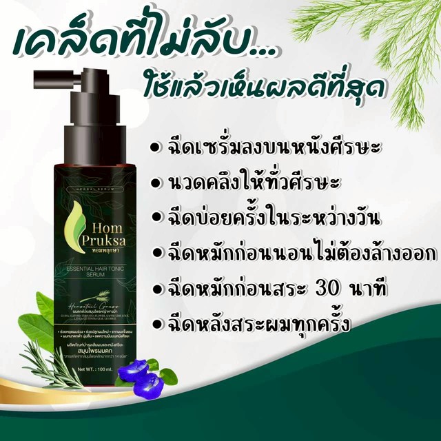 หอมพฤกษา (Hom Pruksa Essential Hair tonic Herbal Serum) แฮร์โทนิค เฮอร์เบิล เซรั่มพูสมุนไพรผมดก สารสกัดจากหญ้าหางม้า โรสแมรี่ ใบฝรั่ง น้ำผึ้ง บอระเพ็ด มะกรูด อัญชัญ ใบเตย และสารกัดหลักมากกว่า 14 ชนิด ไม่มีส่วนสผมของสารเคมี