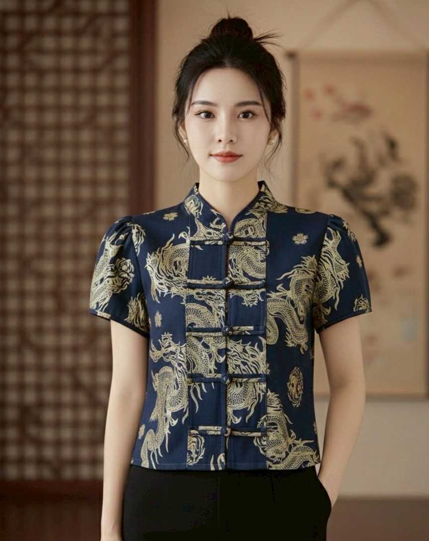 เสื้อตรุษจีนสีดำพิมพ์ลายมังกรทอง ทรงคอจีน กระดุมจีน แขนตุ๊กตา ใส่ตรุษจีน เฮง ๆ ปัง ๆ ค่ะ