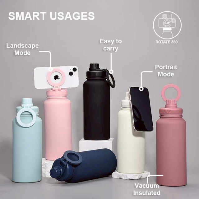 ดีไซน์ใหม่ ขวดน้ำเก็บความร้อนเย็น ฝาแม่เหล็ก สามารถเป็นที่วางโทรศัพท์ได้ สะดวกต่อการใช้งานกลางแจ้ง ออกกำลังกาย แม่และเด็ก โทรศัพท์วางได้ทั้งแนวตั้งและแนวนอน หมุนได้360 องศา ฝาขวดหิ้วง่าย ความจุขนาดใหญ่ 1,000มล.