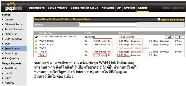4.และยังมีเทคโนโลยีการรวมแบนด์วิธ Speedfusion Cloud เทคโนโลยีขั้นสูงในการส่งทุกแพคเกจ ตรงสู่คลาวด์ ให้ไม่พลาดทุกการเชื่อมต่อสื่อสารผ่านคลาวด์ Microsoft Team , Zoom , Skype , Webex Facebook, Youtube ทำให้ลดการสูญเสียแพ็คเกจระหว่างทาง ทำให้การติดต่อระหว่าง Cilent - Server มีความสเถียรมากขึ้น มีค่า Latency Jitter และ Packet Loss ที่ต่ำกว่าการใช้อินเตอร์เน็ตแบบทั่วไป