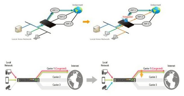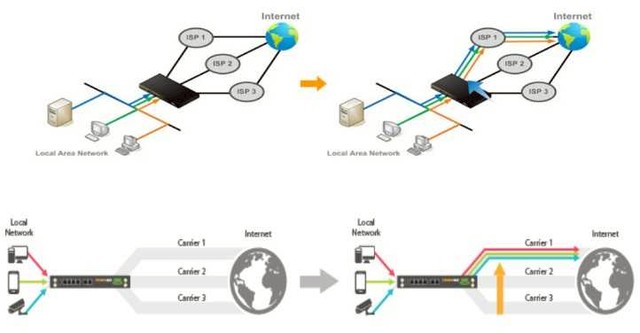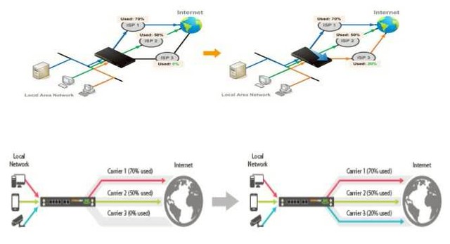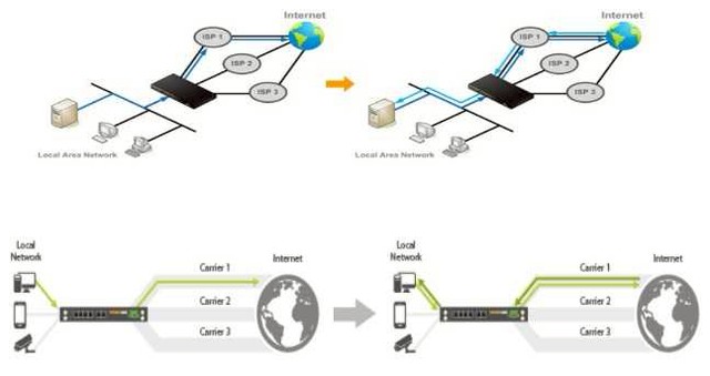 3.Enforced อุปกรณ์สามารถบังคับให้ Traffic ขาออก WAN ใด WAN หนึ่งได้ จะการทำงานเหมือน อัลกอลิธึ่่ม Priority แต่จะต่างกันคือ แบบนี้เป็นการบีบบังคับเลย ว่าจะให้วงแลนนี้ไปออกผ่านเครือข่ายใด เครือข่ายนึงเท่านั้น ไม่ให้ไปออกอินเตอร์เน็ตผ่านซิมอื่น (โซลูชั้่นนี้จะใช้ สำหรับบางแอพพลิเคชั่น เช่นระบบ voip erp payment gateway ที่ต้องการให้ออกอินเตอร์เน็ตผ่าน MPLS หรือ Leaedline , Fiber Optic เท่านั้นถึงจะสื่อสารติดต่อระหว่างเครื่องลูกข่ายและเครื่องแม่ข่าย server ส่วนกลางได้ เป็นต้น