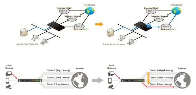 7.Lowest Latency อุปกรณ์สามารถเช็ค Traffic ขาออก ค่า Latency หรือ (PING) ของแต่ล่ะ WAN ที่เชื่อมต่อโดยระบบจะเลือก WAN ที่มีค่า latency ต่ำสุดก่อน ในการออกสู่ Internet เพื่อรวดเร็วในการใช้งา่น ลดการหน่วงของการใช้งานบางแอพพลิเคชั่น เช่น สตรีมมิ่ง , งานแข่งขันเกมส์ หรือระบบ VOIP ติดต่อสื่อสารผ่านเสียง ระบบ Conference ที่ต้องการค่า latencyที่ตำที่สุดส่วนการใช้งานแอพอื่นๆที่ใช้งานอินเตอร์เน็ตทั่วไป ให้ออกอินเตอร์เน็ตผ่าน Loadbalance ปรกติ