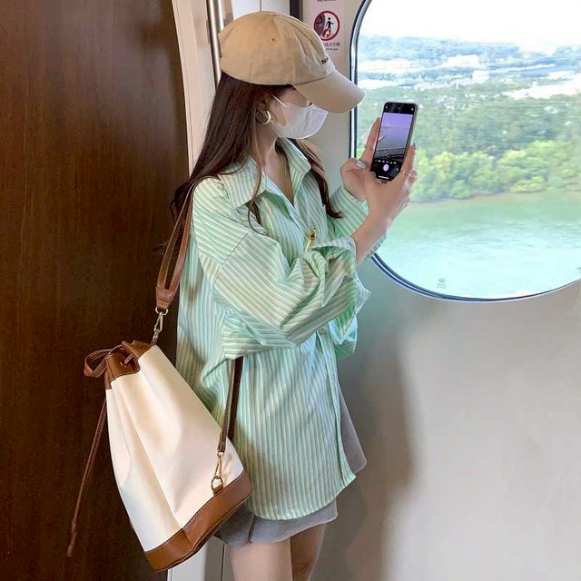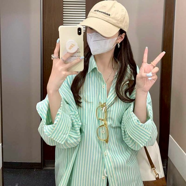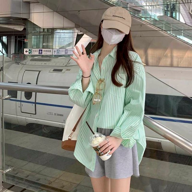 💚 เสื้อ เสื้อเชิ้ต เสื้อลายทาง เสื้อแขนยาว สไตล์เกาหลี เสื้อน่ารัก เนื้อผ้าใส่สบาย ดูดี