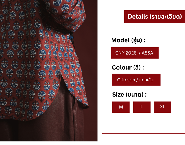 CNY 2026 เสื้อเชิ้ตคอจีนทรงสาบป้าย สีแดงเข้ม ลายดอกไม้ รุ่น ASSA