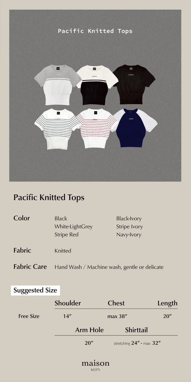 เสื้อไหมพรมผ้าทอนิ่ม มาในทรงแขนสั้นเหนือข้อศอกเล็กน้อยช่วยพรางต้นแขนได้อย่างดี คอกลมทรงพอดีตัว จั๊มช่วงเอวขนาดใหญ่ช่วยให้เอวดูเล็กคอดหลอกตา ขาดไม่ได้เลยคือโลโก้ maison ปักตรงกลางตอกย้ำความเป็นแบรนด์ ใส่แบบเอาช่วงจั๊มเอวเข้าในหรือจะปล่อยออกก็ได้ ช่วยให้ดู chic มากขึ้น