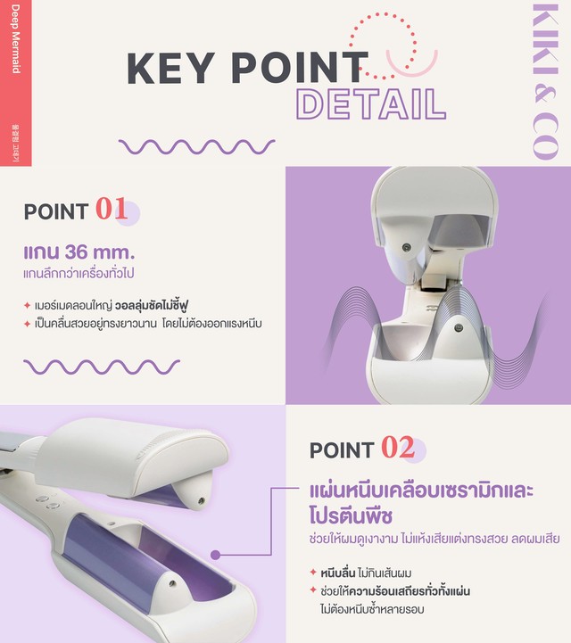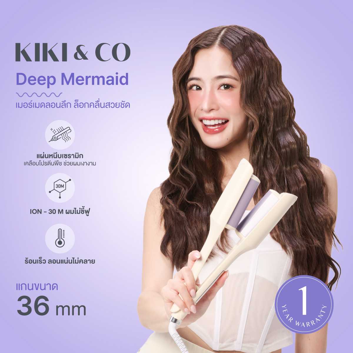 เครื่องหนีบผมเมอร์เมดลอนลึก แกน 36 มม. แกนหนีบเมอร์เมดลอนลึกกว่าเครื่องหนีบทั่วไป ช่วยล็อกทรงให้อยู่นานเป็นคลื่นสวย ลอนชัด มีเลเยอร์ มีมิติ ไม่ยุ่งฟู ถนอมเส้นผม ใช้งานง่าย มีเสียงแจ้งเตือนเมื่อหนีบเสร็จ มาพร้อมช่องปล่อยไอออนลบ 30ล้านตัว ช่วยถนอมเส้นผมมากกว่าเครื่องหนีบผมทั่วไปถึง 10 เท่า ช่วยปิดเกล็ดผม กักเก็บน้ำหรือความชื้นของเส้นผมขณะใช้งานจึง จึงลดการชี้ฟู ให้ผมดูเงางามขึ้นหลังหนีบ เหมาะสำหรับผู้ที่หนีบผมเป็นประจำทุกวันโดยไม่ต้องการให้ผมแห้งเสีย