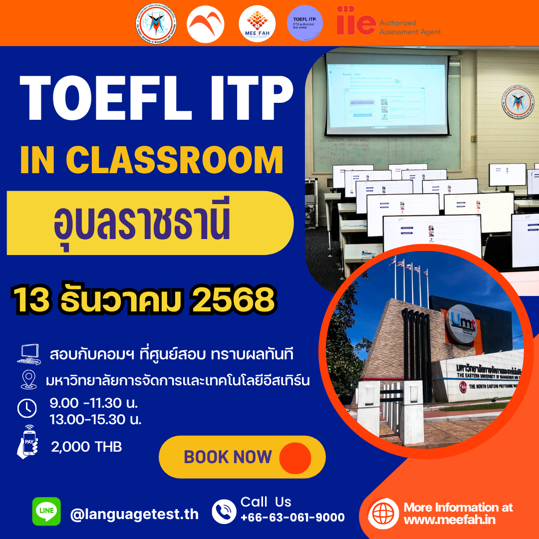 13 ธันวาคม 2025 TOEFL ITP Digital In classroom ศูนย์ทดสอบฯ MEE FAH ร่วมกับ IIE และมหาวิทยาลัยการจัดการและเทคโนโลยีอีสเทิร์น จัดสอบ TOEFL ITP Digital In classroom รอบเช้า 9.00-11.30 และรอบบ่าย 13.00-15.30 น.
