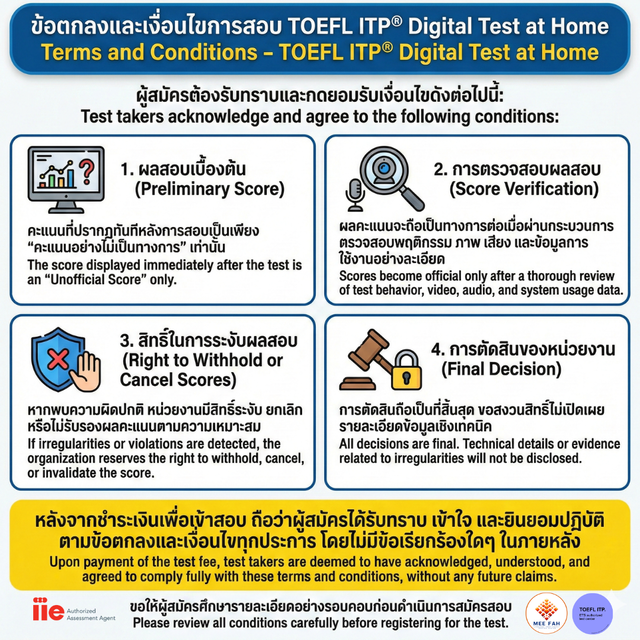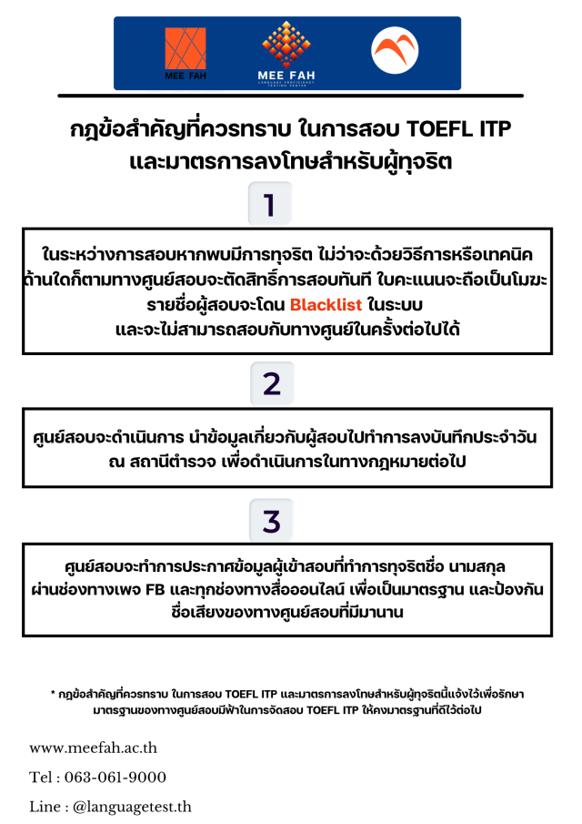 MEE FAH Language Proficiency Testing Center in collaboration with IIE organizes the TOEFL ITP Digital at Home with the test manual sent 3 days in advance after payment of 2,800 baht.