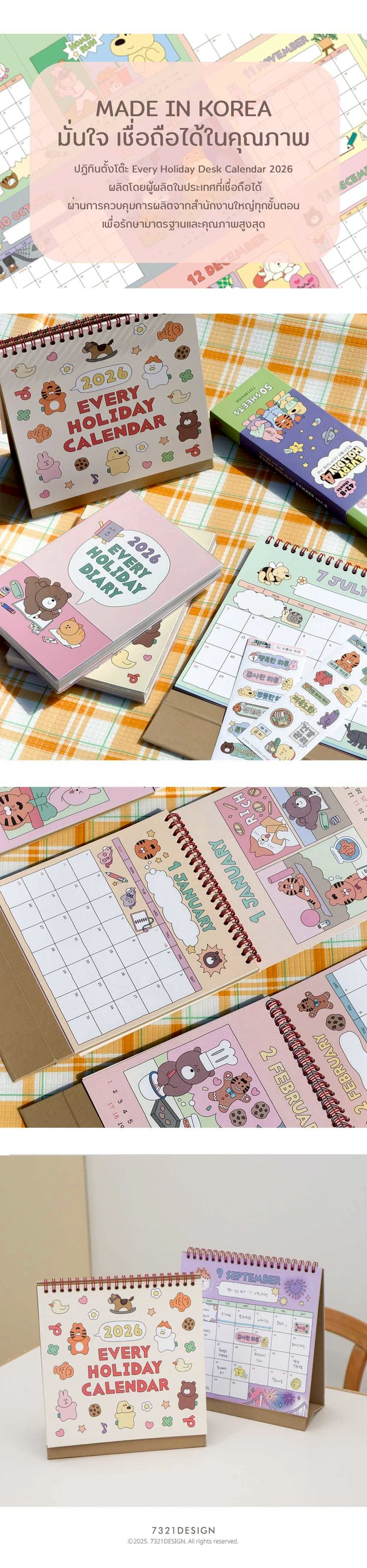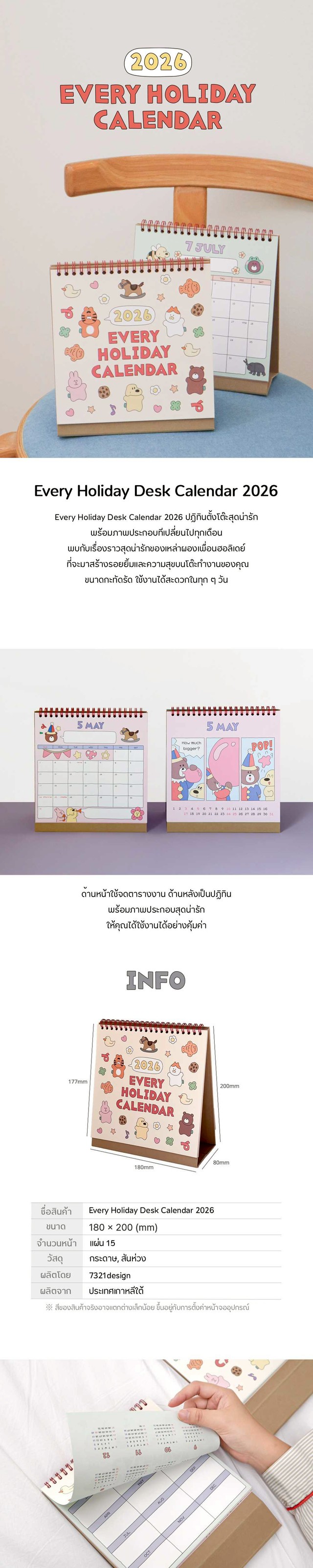 ปฏิทินตั้งโต๊ะสีหวานแหววแต่ละเดือนลายกุ๊กกิ๊กไม่ซ้ำกัน คอนเซปต์การ์ตูนชีวิตประจำวัน ใช้งานได้ทั้งสองด้าน ด้านหน้าใช้บันทึกตารางงานทั่วไป ด้านหลังมีรูปภาพขนาดใหญ่ที่สามารถเช็ควันที่ได้ง่าย กระดาษด้านหนาถึง 180 แกรม เขียนลื่นมือไม่ซึมทะลุ สินค้าลิขสิทธิ์แท้ 7321 Design นำเข้าจากเกาหลี