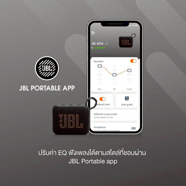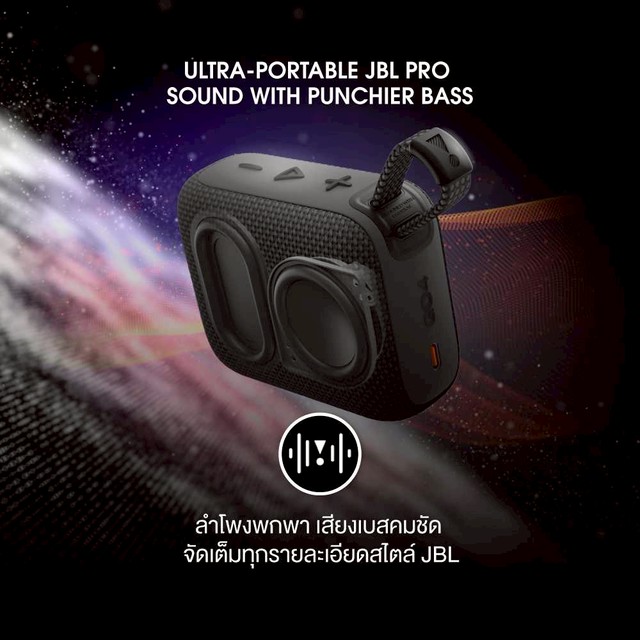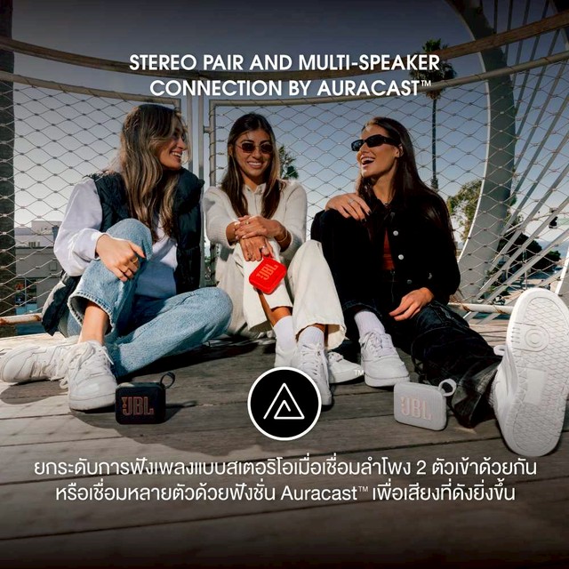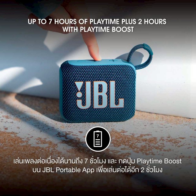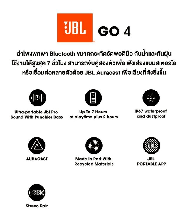 ลำโพงพกพา Bluetooth สีสันสดใส JBL Go4 ขนาดกระทัดรัดพอดีมือ แถมยังกันน้ำและกันฝุ่น ใช้งานได้สูงสุด 7 ชั่วโมง สามารถจับคู่ Go 4 สองอันเพื่อ ฟังเสียงแบบสเตอริโอหรือเชื่อมต่อหลายตัวด้วย JBL Auracast เพื่อเสียงที่ดังยิ่งขึ้น