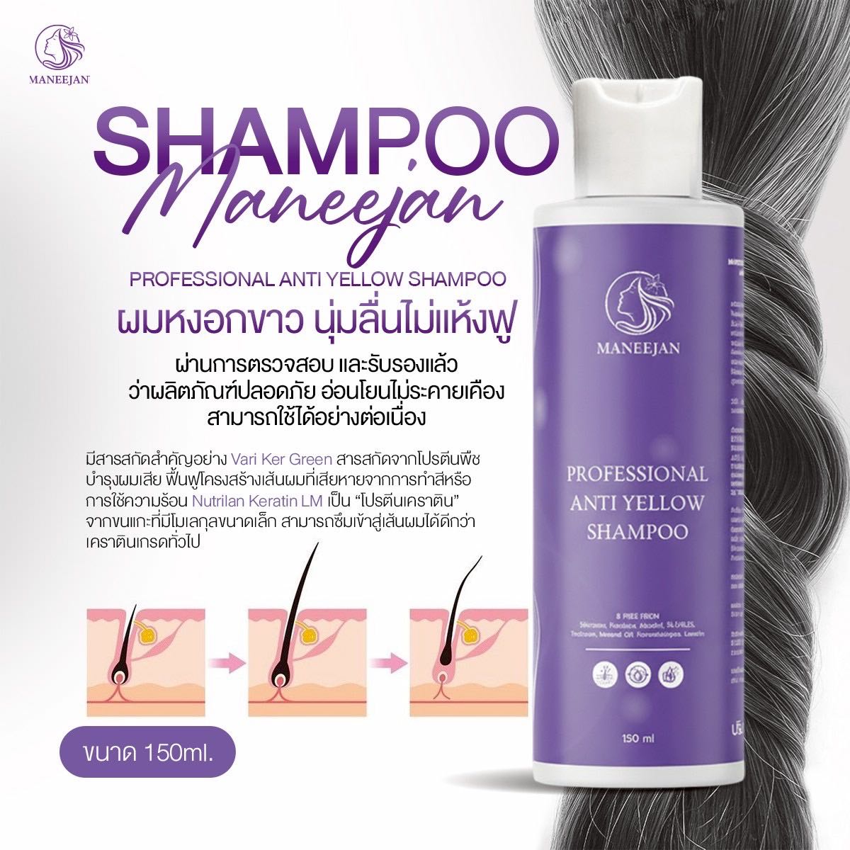 แชมพูม่วง มณีจันทร์ (Profressional Anti Yellow Shampoo) 150 ml. ช่วยลดผมเหลืองและบำรุงผมสำหรับผมหงอกและผมทำสี ให้สีผมดูสม่ำเสมอเป็นธรรมชาติ 🌟