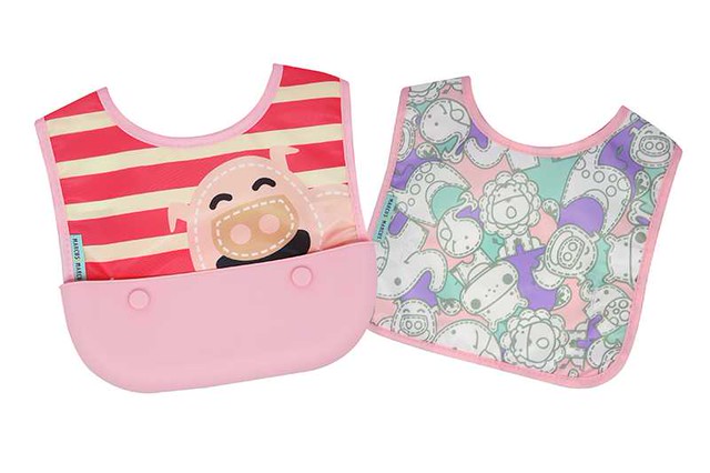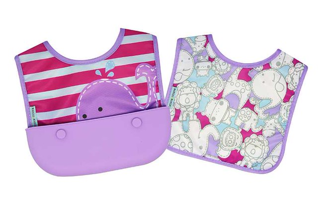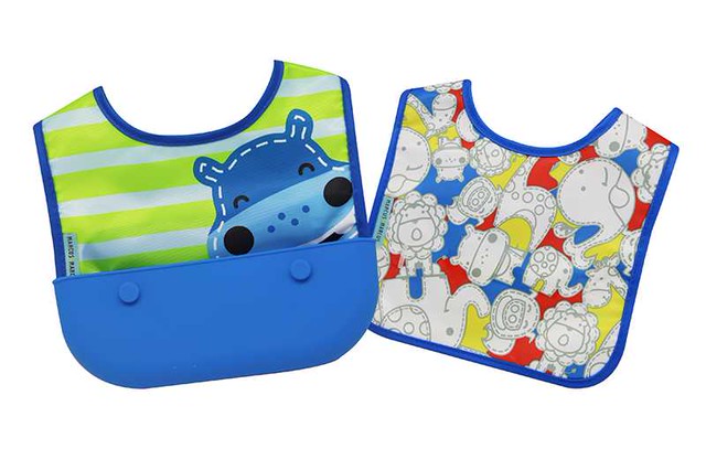 ผ้ากันเปื้อนรุ่นนี้เก๋มากตรงที่ใน 1 set มีผ้ากันเปื้อนผลิตจากผ้า polyester 2 ชิ้น พร้อมกระเป๋าซิลิโคน 1 ชิ้น ที่สามารถนำมาติดกระดุมเข้ากับผ้ากันเปื้อนเพื่อใช้เป็นที่รองอาหารกันหกได้ แถมยังใช้เป็นกระเป๋าเก็บผ้ากันเปื้อนและช้อนส้อมได้อีกด้วย