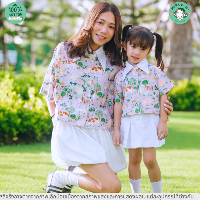 ดีไซน์น่ารักสดใส ทรง oversized ใส่คู่กับกระโปรงบานสีขาวผ้าคอตตอนที่มาคู่กันหรือจะใส่กับกางเกงก็เข้ากัน