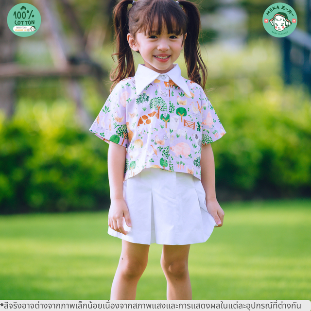 ชุด Set เสื้อครอปคอปกแหลมขาว ลายฟาร์มสุข พร้อมกระโปรงสั้นสีขาว Cotton 100%