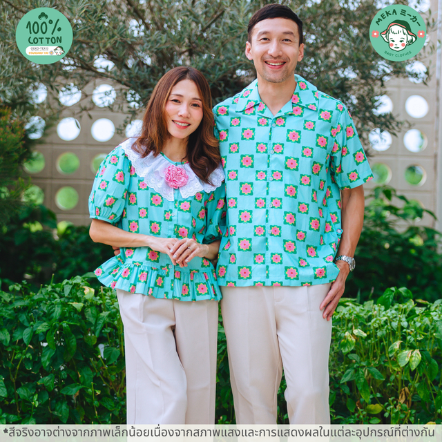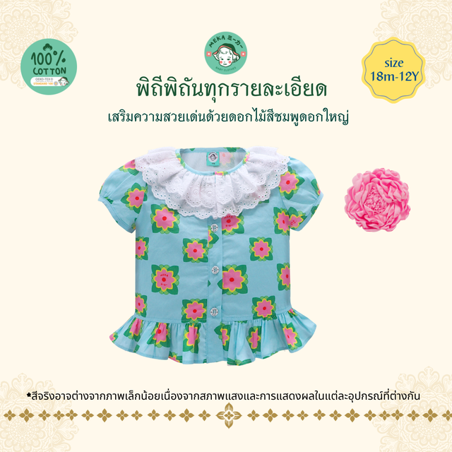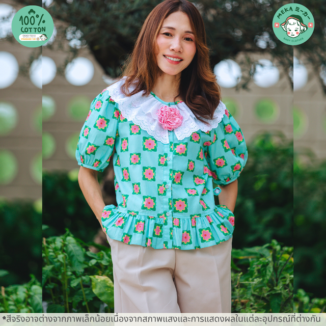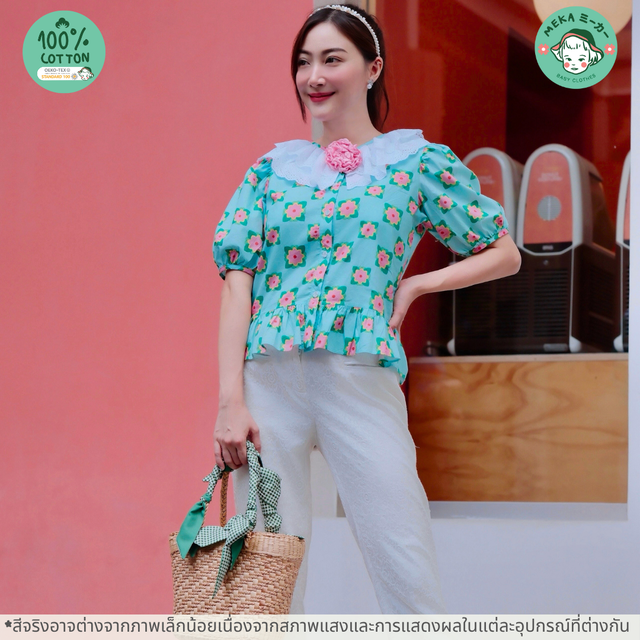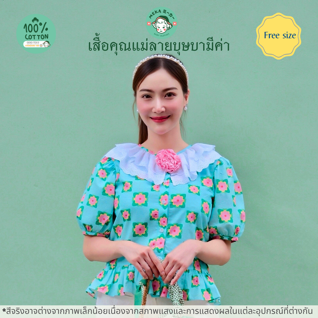 เสื้อผู้หญิง เสื้อเชิ้ตคุณแม่ แขนตุ๊กตา ระบายที่เอว Cotton 100% ลายบุษบามีค่า