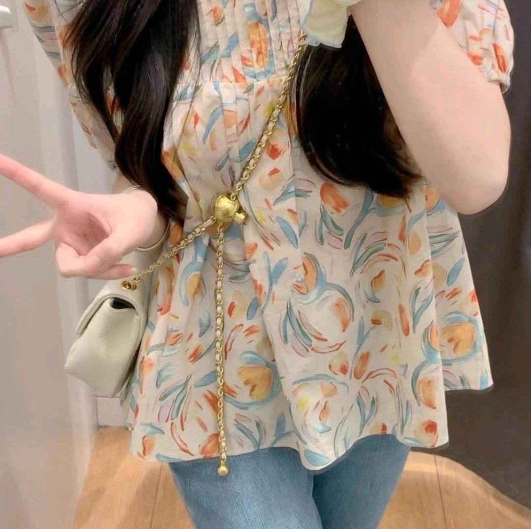 เสื้อแขนสั้น เสื้อแขนสั้น สีครีม ผ้าคอตตอน 100% ดีเทลพิมพ์ลายกราฟฟิก สีฟ้าส้ม แต่งระบาย แขนสม็อค แมทช์กับกางเกงหรือกระโปรง แมทช์ได้หลายลุค ใส่ไปเที่ยว ใส่ไปทำงาน ใส่ไปงานบุญ ใส่ได้ทุกโอกาส ( S-ฟ้าส้ม03 )