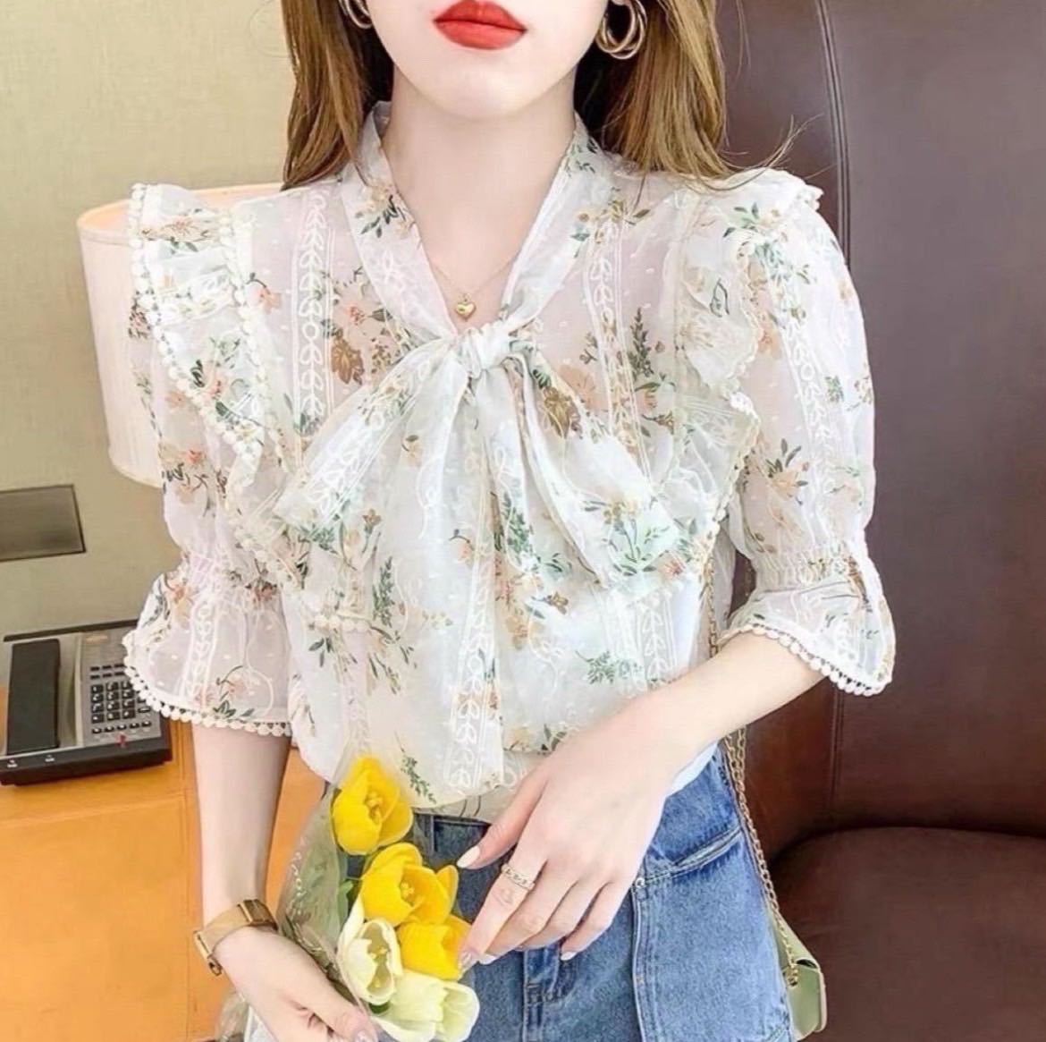 เสื้อแขน3ส่วน เสื้อแขน3ส่วน ผ้าชีฟองพรีเมี่ยม มีซับใน สีขาว ลายดอกไม้ ดีเทลปักฉลุ แต่งระบายด้านข้าง ตรงหน้าอกมีโบว์ผูก งานแขนสม็อคปลายระบาย ใส่แล้วให้ลุคคุณหนูคุณใจ น่ารัก ใส่แมทช์กับกางเกงหรือกระโปรงได้ ใส่ไปเที่ยว ใส่ไปทำบุญ ใส่ออกงาน ใส่ได้ทุกโอกาส ( ดอกน้ำตาลผูกโบว์ )