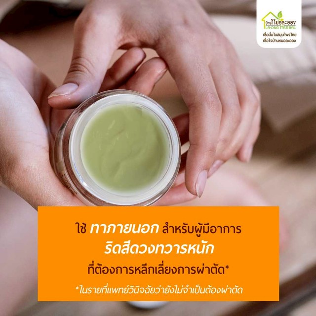 สำหรับผู้เป็นริดสีดวงทวารหนักภายนอก มีหัวริดสีดวงทวารงอกออกมาด้านนอก แนะนำให้ทานยาแคปซูลสมุนไพรคู่กับการทาบาล์มสมุนไพรริดเฮิร์บสที่หัวริดสีดวงเป็นประจำ จะบำบัดอาการต่างๆ เห็นผลลัพธ์ได้ดีขึ้น