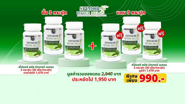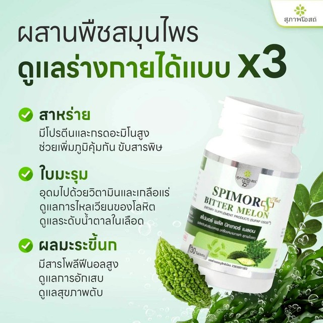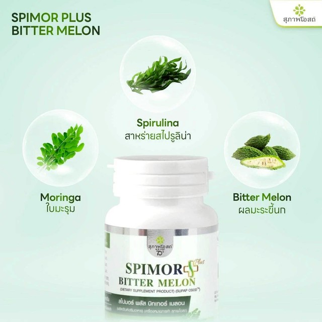 Spimor plus Bitter Melon อาหารเสริมเพื่อสุขภาพครบวงจร พลังแห่งธรรมชาติ ผสาน 3 สารสกัดสุดยอดจากธรรมชาติ พลังล้นเหลือดีต่อสุขภาพในเม็ดเดียว ทั้งสไปรูลิน่า ใบมะรุม และผลมะระขี้นก
