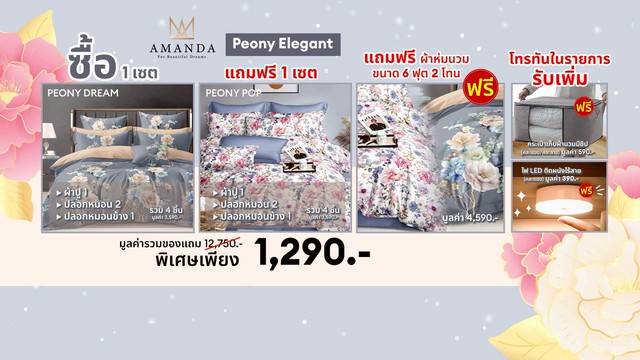 ชุดผ้าปูที่นอน Amanda Peony Elegant ขนาด 6 ฟุต 2 เซต 2 ลาย พร้อมของแถม 20090069