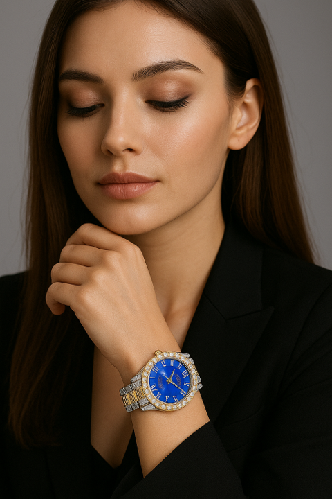 - ตัวเรือนของนาฬิกามีการประดับเพชรอย่างวิจิตร เพื่อเพิ่มความหรูหราและความเงางาม ทำให้ดูโดดเด่นและมีเสน่ห์ในทุกการใช้งาน