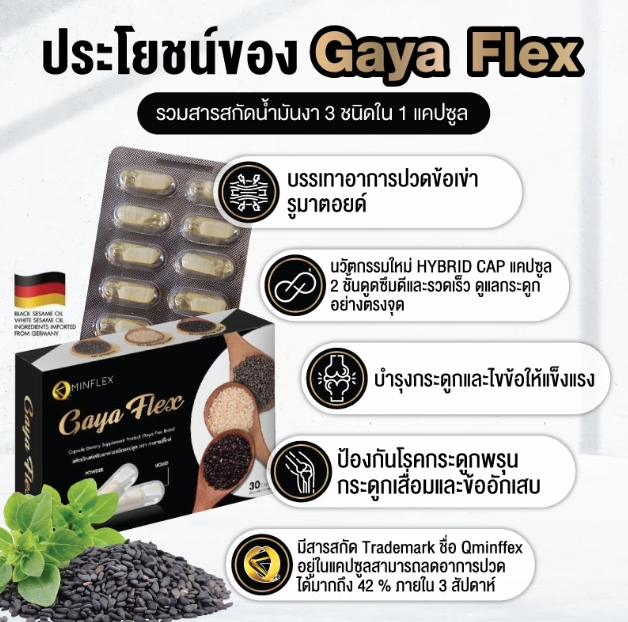 Gaya Flex (กายาเฟล็กซ์) ผลิตภัณฑ์เสริมอาหารชนิดแคปซูล ที่เน้นบำรุงกระดูกและข้อต่อ โดยมีส่วนประกอบหลักจากน้ำมันงา (งาดำ งาขาว และงาขี้ม้อน) สารสกัดจากขมิ้น และวิตามิน D3 เพื่อช่วยลดการอักเสบ, บำรุงข้อเข่า, กระดูกพรุน และบรรเทาอาการปวดเมื่อย ที่สำคัญคือมีนวัตกรรม "ไฮบริด แคป" (Hybrid Cap) แคปซูลสองชั้นที่รวมน้ำมันและผงไว้ในเม็ดเดียว ทำให้ดูดซึมง่าย
