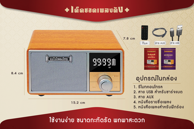 เครื่องเล่นเพลงที่บรรจุบทเพลงต้นฉบับระดับตำนาน ในยุคทองของเพลงไทย (2500 - 2510) ถึง 800 บทเพลง ให้ผู้ฟังได้ระลึกถึงความสุข ความทรงจำเมื่อวันวาน ผ่านเสียงร้องเดิม ดนตรีเดิม สร้างความสุข และรอยยิ้มให้คุณพ่อคุณแม่ สมัยท่านยังเป็นหนุ่มสาว ดีไซน์สวยงาม ตัวเครื่องวัสดุอุปกรณ์ที่ดี ลำโพงคุณภาพ เพื่อคุณภาพเสียงที่ดี