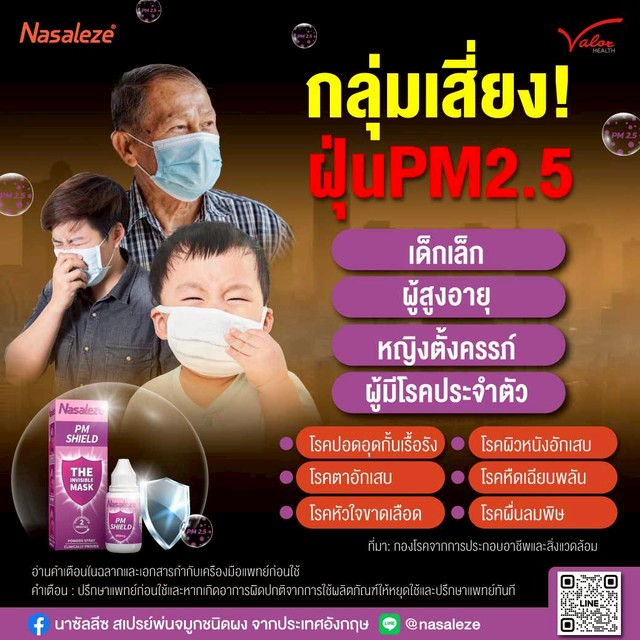 เพื่อป้องกันฝุ่นละอองและสารมลพิษ ให้บีบพ่นนาซัลลีซ พีเอ็ม ชีลด์ วันละ 2-3 ครั้ง
