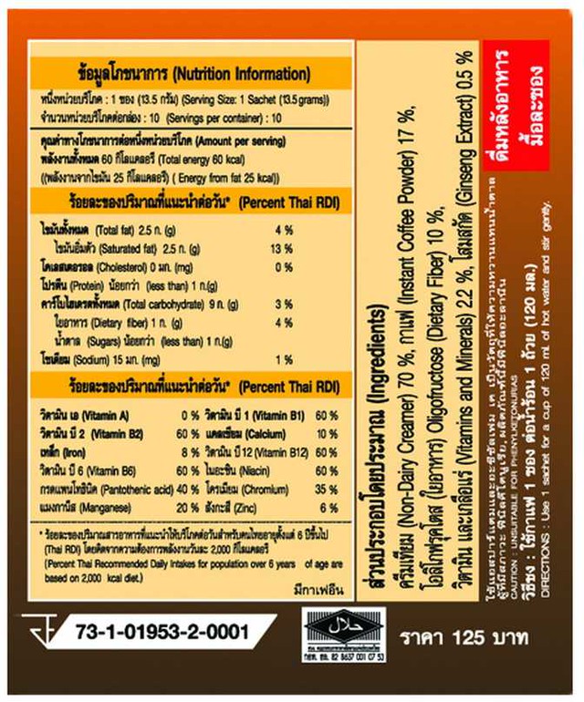 กาแฟปรุงสำเร็จ ชนิดผง ผสมโสมสกัด วิตามิน เกลือแร่ และใยอาหารคุณสมบัติสุขภาพที่ดี คือพื้นฐานความสุขของเรา อยากมีสุขภาพดี ก็ต้องอยู่ในที่ที่อากาศบริสุทธิ์ ดื่มน้ำสะอาด ทานอาหารให้ครบ 5 หมู่ ในสัดส่วนที่เหมาะสม แต่ด้วยกระบวนการผลิตอาหาร และด้วยวิถีชีวิตในปัจจุบัน ทำให้ร่างกายของผู้คนทั้งหลาย ขาดใยอาหาร วิตามิน เกลือแร่ ที่มีความจำเป็นต่อกระบวนการทำงานของเซลล์ และของอวัยวะต่างๆ เมื่ออวัยวะต่างๆ ไม่สามารถทำงานได้อย่างมีประสิทธิภาพ ก็จะทำให้สุขภาพทรุดโทรม จนเกิดโรคภัยต่างๆ ขึ้น เช่น โรคเครียด ท้องผูก เบาหวาน และโรคอ้วน เป็นต้นผลิตภัณฑ์ เนเจอร์กิฟ ตัวนี้ ได้ผสานคุณค่าของ โสมสกัด ใยอาหาร พร้อมวิตามิน เกลือแร่ สูตรเฉพาะ จาก เนเจอร์กิฟ ที่จะช่วยให้คุณ ดูแลรูปร่าง และสุขภาพได้ง่ายๆ เพียงทานทุกมื้อหลังอาหาร มื้อละหนึ่งซองเท่านั้นหมายเหตุ ใยอาหารและวิตามิน จาก ยุโรป แร่ธาตุชนิดคีเลท ดูดซึมง่าย จาก สหรัฐอเมริกา