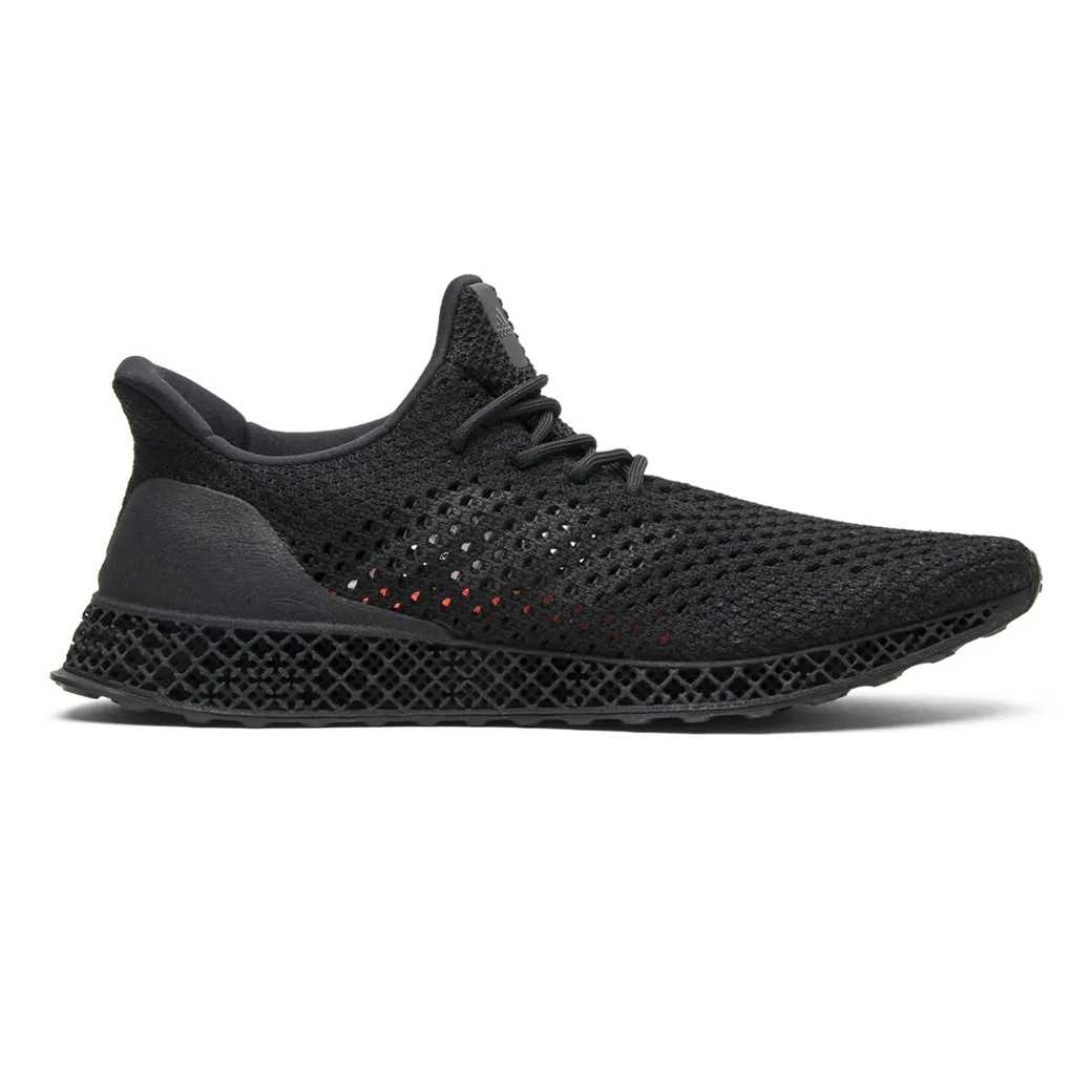 The adidas 3D Runner incorporates a 3D-printed midsole, which features a diamond shaped pattern that provides a greater density in high-impact zones. The heel counter, also 3D-printed, is integrated into the sole. The Triple Black color scheme is paired with a Primeknit application on the upper, which forms a sock-like fit.