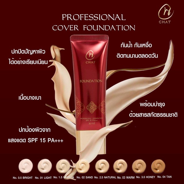 รองพื้นรุ่นใหม่ เนื้อสัมผัสซาติน เกลี่ยง่าย แนบสนิทชิดกับผิว ปกปิดสนิท สีสันสวยงามเข้ากับเฉดสีผิว พัฒนาและออกแบบโดยน้องฉัตรช่างแต่งหน้าผู้มากประสบการณ์โดยตรงกว่า 20 ปีในวงการโดยใช้เวลาพัฒนาผลิตภัณฑ์ตัวนี้มากกว่า 2 ปี ดังนั้นมั่นใจได้เลยว่า ทุกท่านจะได้รับสินค้าคุณภาพดีแน่นอน มี 4 เฉดสี