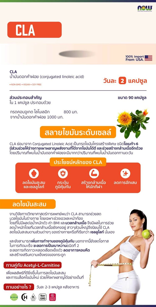 - CLA ย่อมาจาก Conjugated Linoleic Acid เป็นกรดไขมันโครงสร้างพิเศษ ในกลุ่มกรดไขมันจาเป็นชนิดโอเมก้า-6 เป็นกรดไขมันจาเป็นที่ร่างกายสร้างไม่ได้ มีส่วนช่วยให้ร่างกายเผาผลาญพลังงานที่ได้จากไขมันได้ดี ขณะเดียวกันยังคงมวลกล้ามเนื้อได้ด้วยจึงนิยมใช้กันมากในกลุ่มนักกีฬา