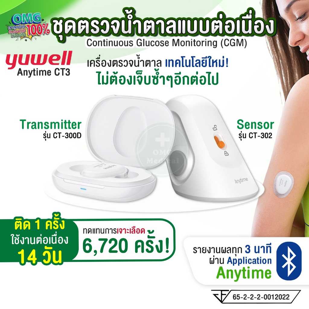 ✨ ชนิดแบตเตอรี่รีชาร์ตได้ ใช้ได้ 14 วัน เทียบเท่าการเจาะเลือด 6,720 ครั้ง แบรนด์ YUWELL รุ่น Anytime CT3 ✨