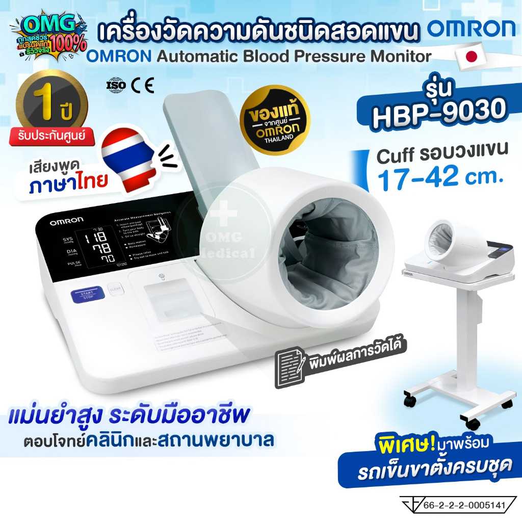 เครื่องวัดความดันโลหิตอัตโนมัติชนิดสอดแขน OMRON รุ่น HBP-9030 รองรับเสียงภาษาไทย มีจอแสดงผลสามารถแสดงค่า Systolic, Diastolic และ PulseRate ได้ มีผ้ารอง Cuff สามารถถอดซักได้ ใช้งานง่าย สะดวก แม่นยำ มีระบบปริ้นท์ รองรับผู้ใช้งานจำนวนมาก ความแม่นยำสูง ได้รับการยอมรับจากผู้เชี่ยวชาญทางการแพทย์ เหมาะสำหรับใช้ในสถานพยาบาลหรือคลินิก ใช้ได้กับผู้ใหญ่และเด็กตั้งแต่ 12 ปีขึ้นไป