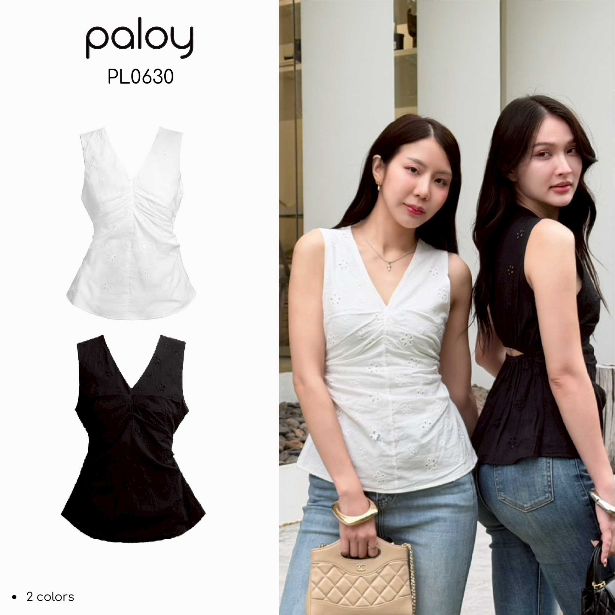 Paloy - PL0630 เสื้อแขนกุดคอวี แต่งฉลุดอกไม้ ดีเทลเว้าหลังชายโค้ง
