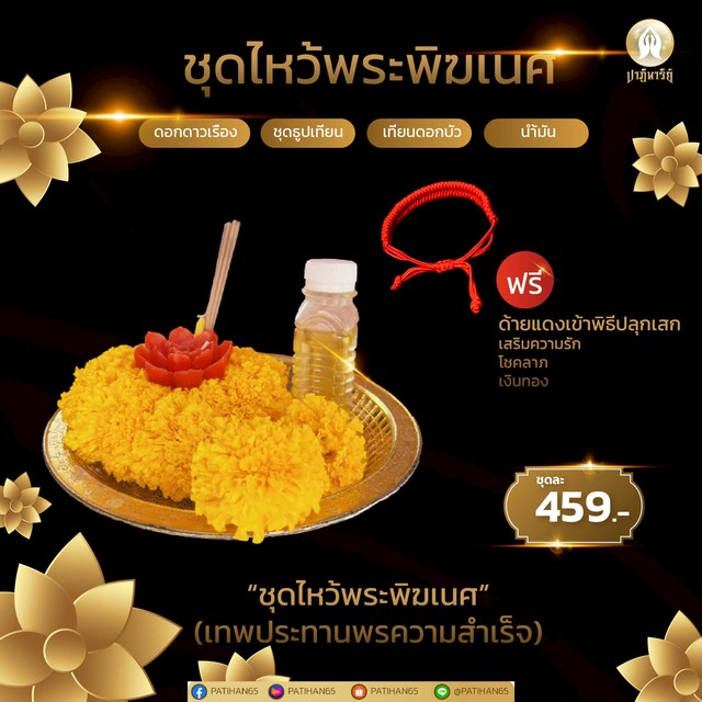 สินค้าประกอบไปด้วย : พวงมาลัยดาวเรือ, เทียนดอกบัว, น้ำมัน, ชุดไหว้ธูปเทียน