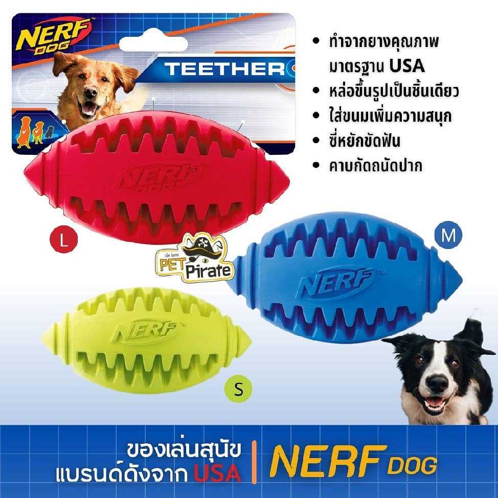 • Nerf Dog Teether Football ลูกอเมริกันฟุตบอล/รักบี้ยาง มีหยักรับฟันที่จะทำหน้าที่ขัดถูเอี๊ยดอ๊าดขณะที่เจ้าตัวแสบตั้งใจฟัดกัดแทะลูกฟุตบอลนี้อย่างเมามัน