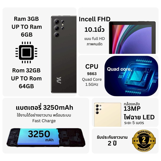 หน่วยความจำ : RAM 3 GB ROM 32 GB (UP TO Ram 6 Rom 64)