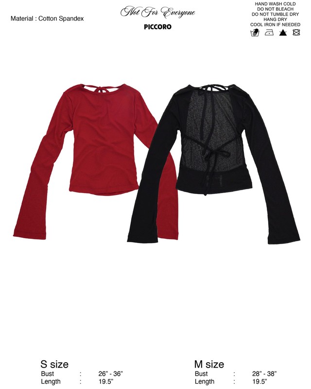 Open Back Top with Long Sleeves, made from see-through cotton spandex, offers a fitted silhouette with an open back for a chic and daring look.