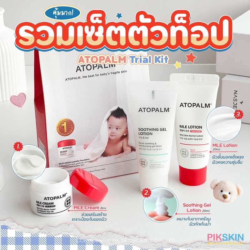 1.ATOPALM Soothing Gel Lotion 20ml โลชั่นเนื้อกึ่งเจล ทำให้เนื้อบางเบาและเหมาะกับอากาศร้อนมากๆ อีกทั้งยังสามารถเก็บกักน้ำและความชุ่มชื้นให้กับผิวได้ดีกว่าโลชั่นทั่วไป ดังนั้นเจลโลชั่นตัวนี้เหมาะกับอากาศที่ร้อนแบบบ้านเรามากๆ อีกทั้งยังช่วยเสริมชั้นผิวให้แข็งแรงจากเทคโนโลยีสิทธิบัตร MLE ™ ซึบซาบได้ดี เหมาะสำหรับทุกสภาพผิว