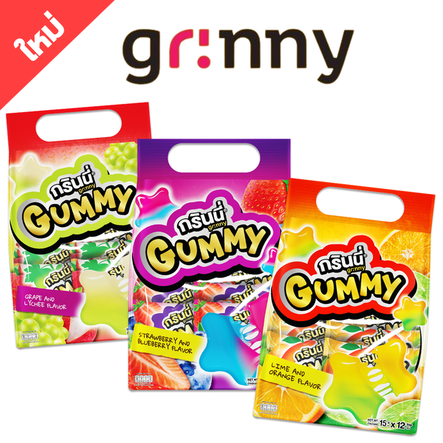 ขนมวุ้นสำเร็จรูปเพคตินตรา GRINNY Gummy มีส่วนผสมของน้ำผลไม้ เนื้อนุ่มเด้ง เคี้ยวเพลิน มี 2 รสชาติในซอง 1 ถุง บรรจุ 12 ซอง ขนาด 15 กรัม มีให้เลือกอร่อยได้ 3 รสชาติ: องุ่นและลิ้นจี่, มะนาวและส้ม, สตรอเบอร์รี่และบลูเบอร์รี่