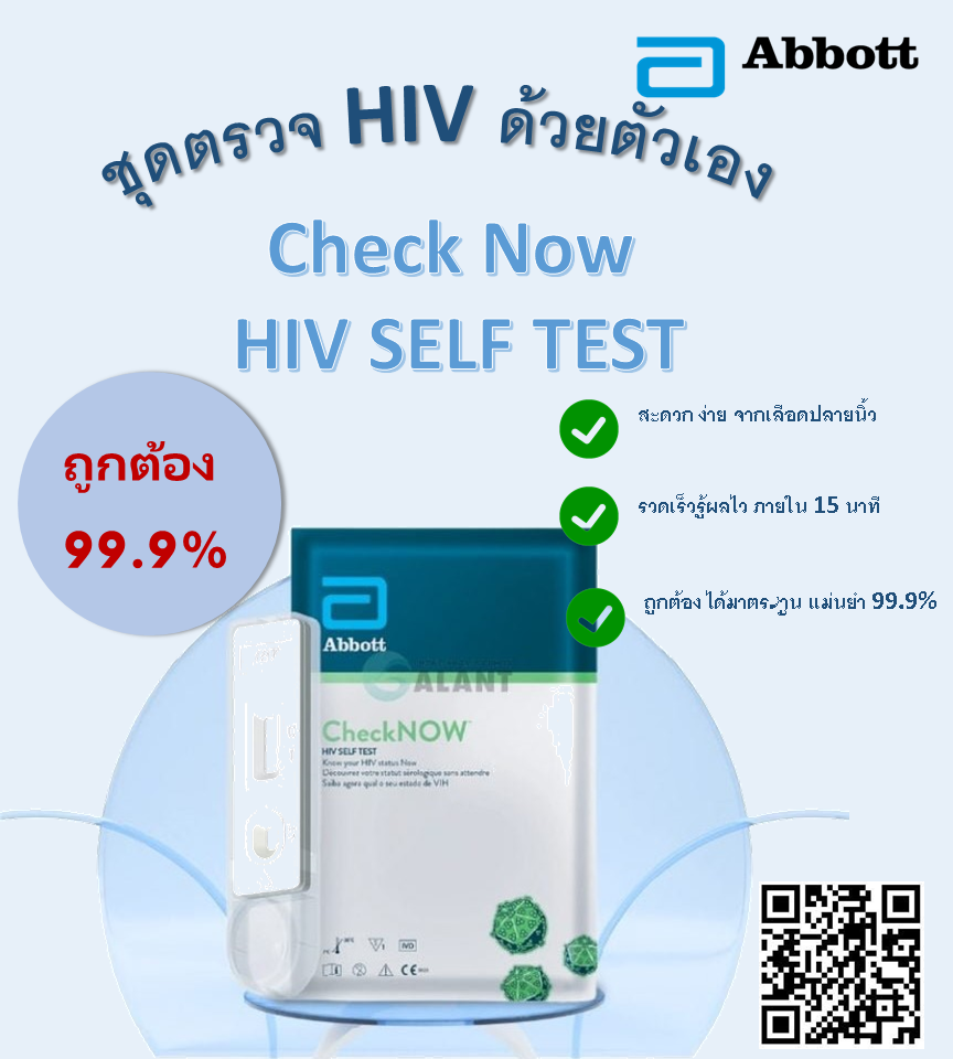 Abbott CheckNOW™ HIV SELF TEST ช่วยให้คุณรู้ผลตรวจ HIV ของคุณในเวลาเพียง 15 นาที มีความรวดเร็วและสะดวกสบาย ที่บ้านโดยการใช้เลือดจากปลายนิ้วง่ายๆ เทคโนโลยีการทดสอบ HIV รุ่น ที่ 3 ของเราจะตรวจจับแอนติบอดีต่อ HIV-1 และ HIV-2 ในตัวอย่างเลือดจากปลายนิ้ว เหมาะอย่างยิ่งสำหรับการใช้งานในโปรแกรมการทดสอบ HIV ขนาดใหญ่ CheckNOW™ HIV SELF TEST ทำให้การทดสอบเข้าถึงได้ง่ายขึ้นสำหรับผู้ที่ต้องการทราบสถานะ HIV ของตนเอง