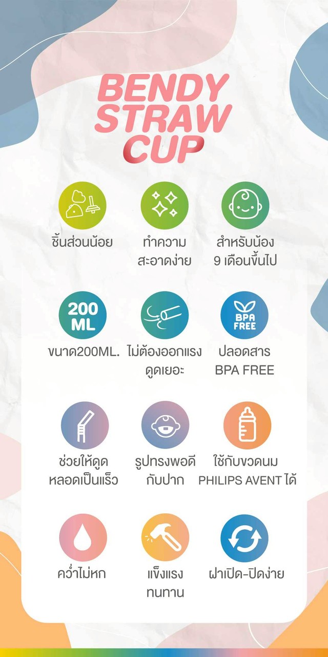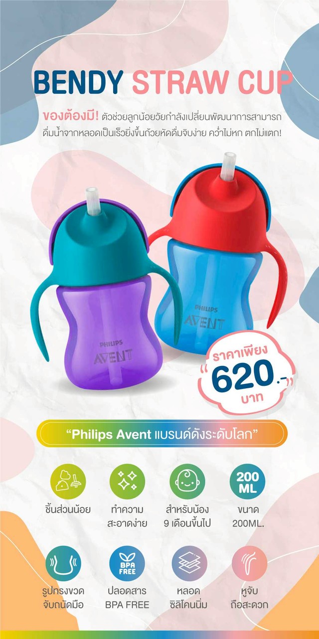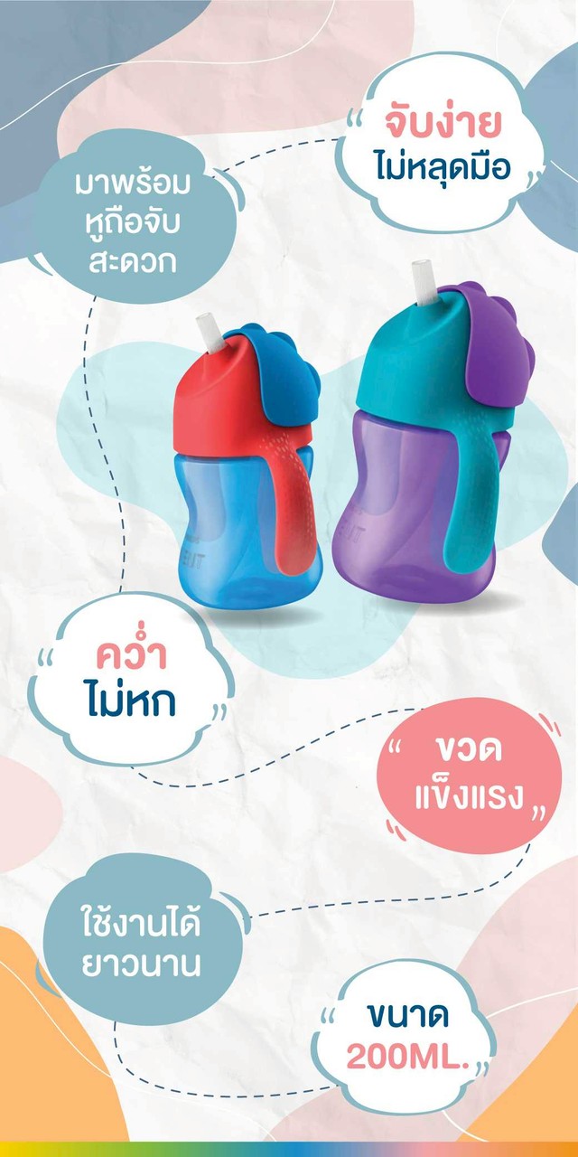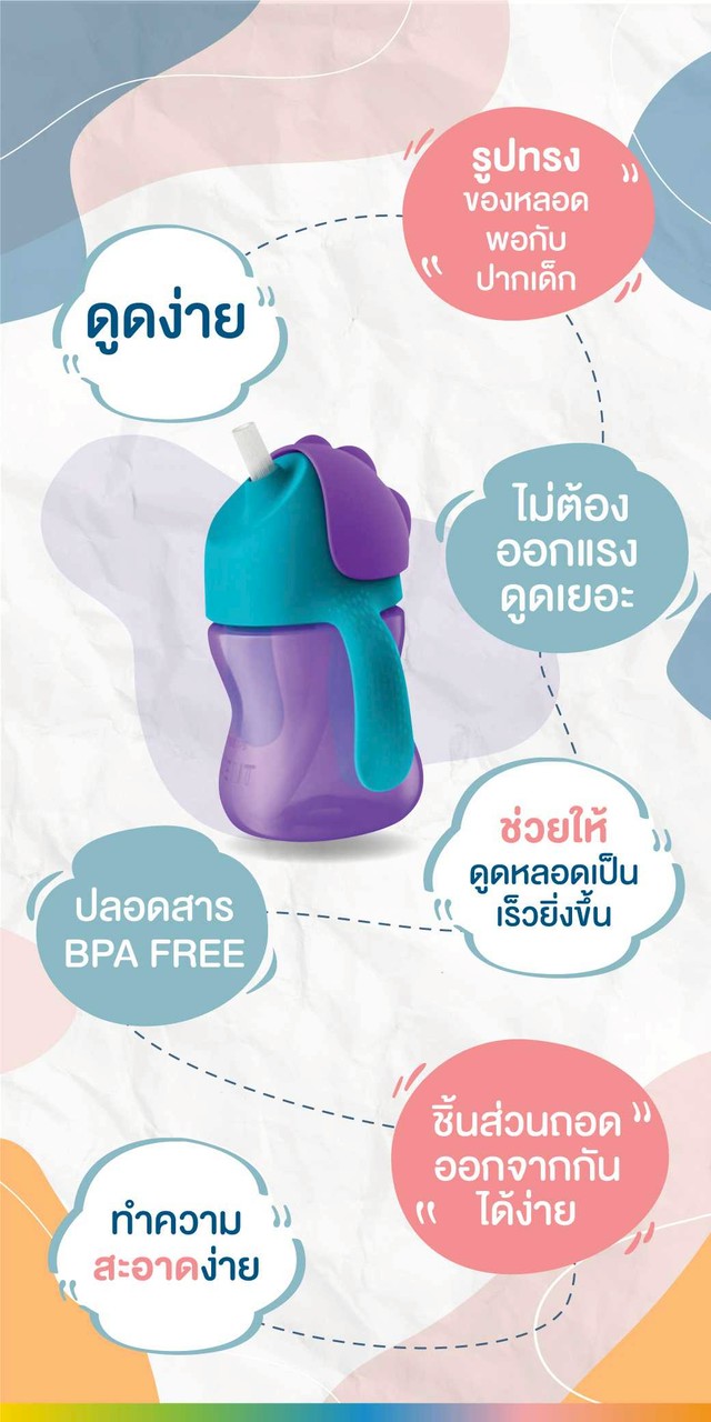 ขวดหัดดื่มที่ออกแบบตามหลักสรีรศาสตร์ของเด็ก เพื่อเสริมสร้างพัฒนาการของลูกน้อยในการพร้อมสำหรับดื่มน้ำจากหลอดได้ และดูดเป็นเร็วขึ้น ตัวขวดมาพร้อม Anti-leak valve design ป้องกันการรั่วไหลอย่างดี